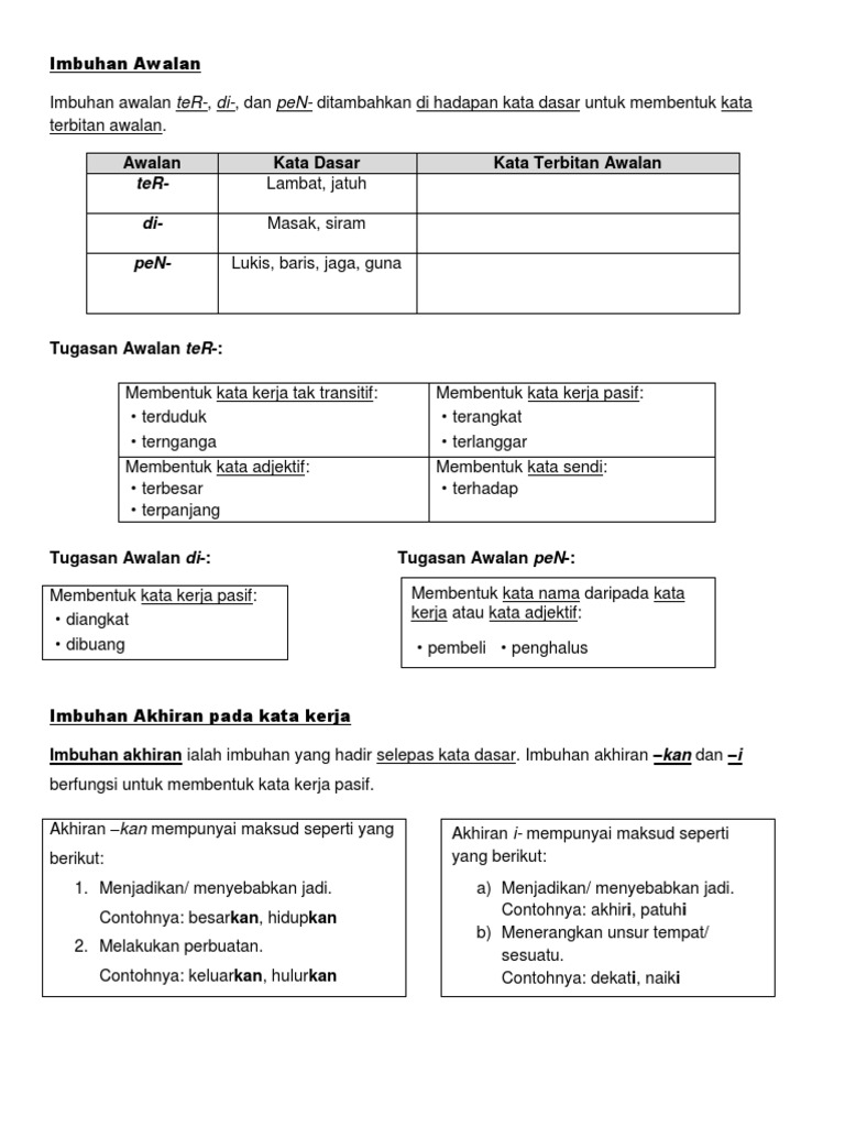 Nota Imbuhan Akhiran Tahun 2 from img.17qq.com Menurut laman kbbi,kemendikbud.go.id, imbuhan diartikan sebagai bubuhan pada suatu kata dasar yang membentuk suatu kata yang baru. Pada artikel ini kita akan membahas keempat macam. Awalan ber yang melekat pada kata dasar mempunyai makna/arti sebagai berikut : Pada umumnya imbuhan (afiks) hanya dikenal ada empat, yaitu awalan (prefiks), sisipan (infiks), akhiran (sufiks), awalan dan akhiran (konfiks). Imbuhan sebenarnya terbahagi kepada empat jenis iaitu imbuhan awalan, akhiran, apitan dan sisipan. Imbuhan memiliki fungsi untuk memberikan dan memperkuat makna dan tujuan dari kata dasar yang dikenai dengan imbuhan tersebut. Awalan dan akhiran adalah imbuhan yang berupa integrasi dari kedua imbuhan tersebut. If you can't read please download the document.